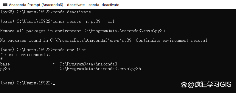 删除完毕,我们再用前文提到的语句浏览当前Anaconda中全部的环境情况,会得到如下图所示的结果;可以看到,py39这个刚刚删除的虚拟环境就不再存在了。